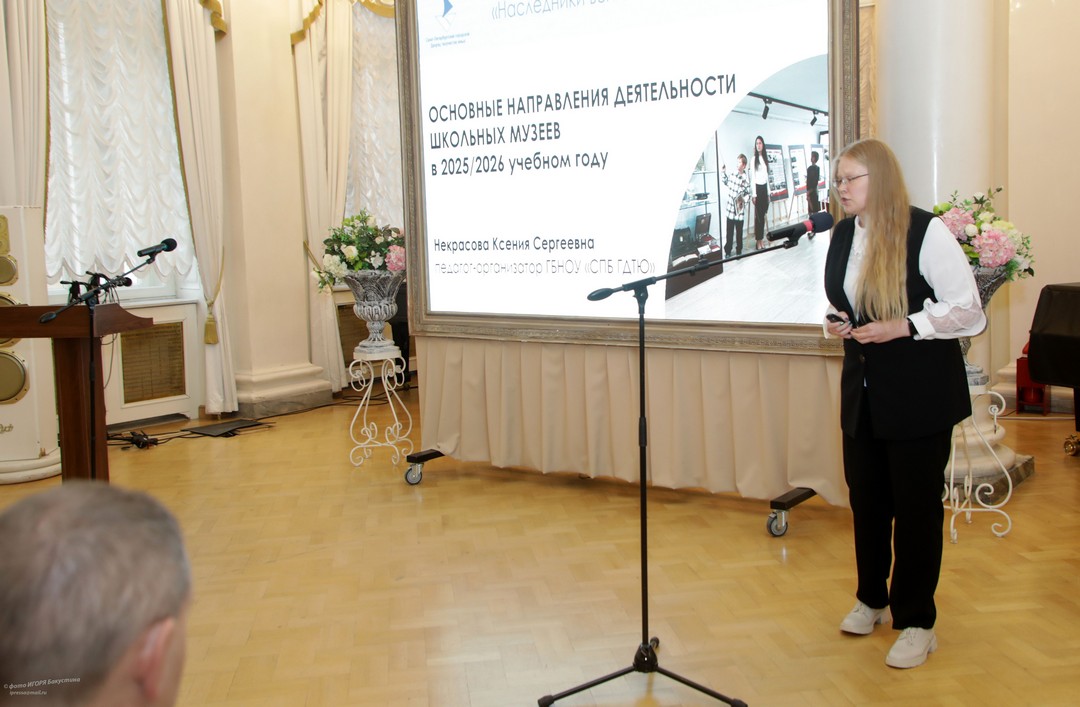 18 сентября в Белоколонном зале Аничкова дворца состоялся информационно-методический семинар для методистов по краеведению и школьному музееведению, руководителей школьных музеев и педагогов-краеведов «Основные направления городской комплексной краеведческой программы патриотической направленности «Наследники великого города» на 2025-2026 учебный год».