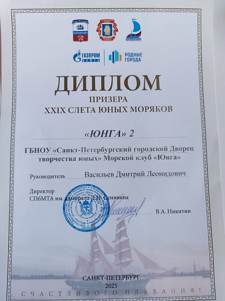 По результатам Слета команды клуба «Юнга-1» (младшая возрастная группа, руководитель Сергей Юрьевич Николаев, педагог Алексей Викторович Жилин) и «Юнга-2» (средняя возрастная группа, руководитель Дмитрий Леонидович Васильев и педагог Кирилл Иванович Комендантов) заняли 3-е общекомандное место в своих возрастных группах.