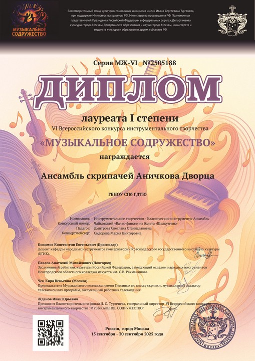 В номинации «Инструментальное творчество (Классические инструменты)» образцовый детский коллектив Ансамбль скрипачей Аничкова дворца и солистка Струнного сектора Анна Филонова (скрипка) успешно выступили на конкурсе и завоевали дипломы лауреатов I степени!