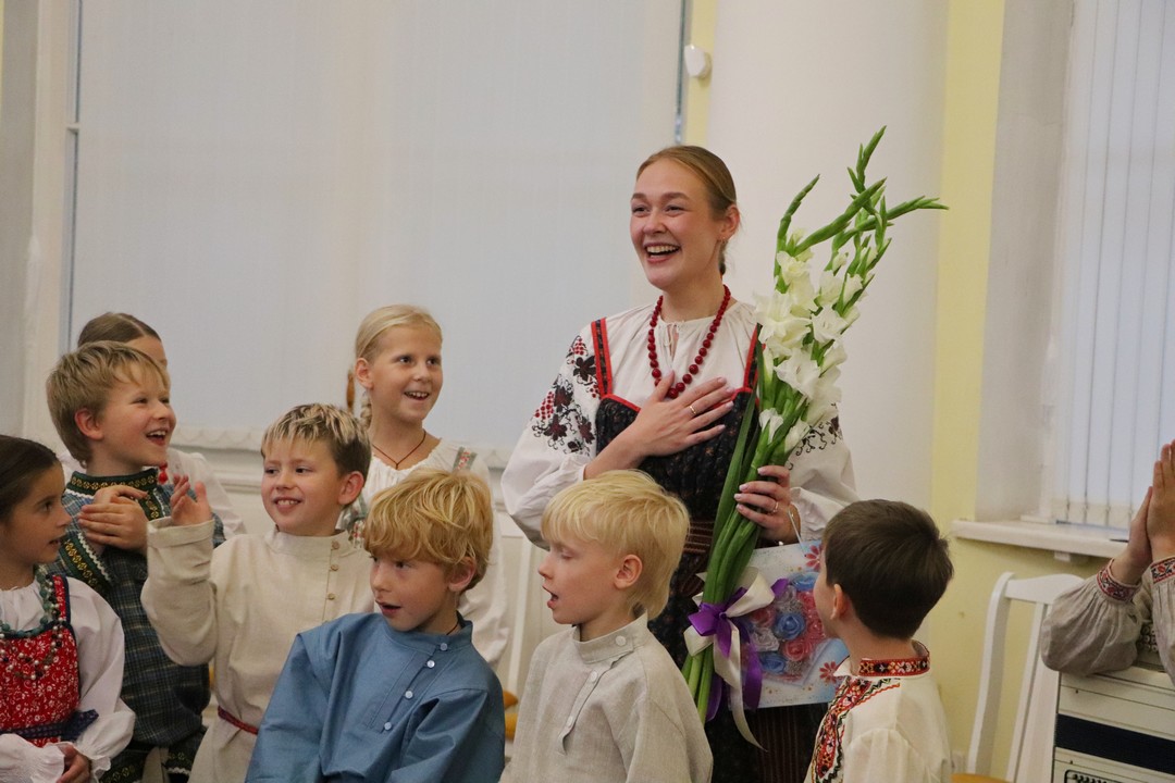У старшей группы «Теремка» в этом году появился новый предмет – «Расшифровка народной песни», где обучающиеся самостоятельно на слух прописывают слова и особенности звучания. На праздничном вечере ребята продемонстрировали чему успели научиться за первый учебный месяц и спели песню 1817 года «Возле речки, возле моста».