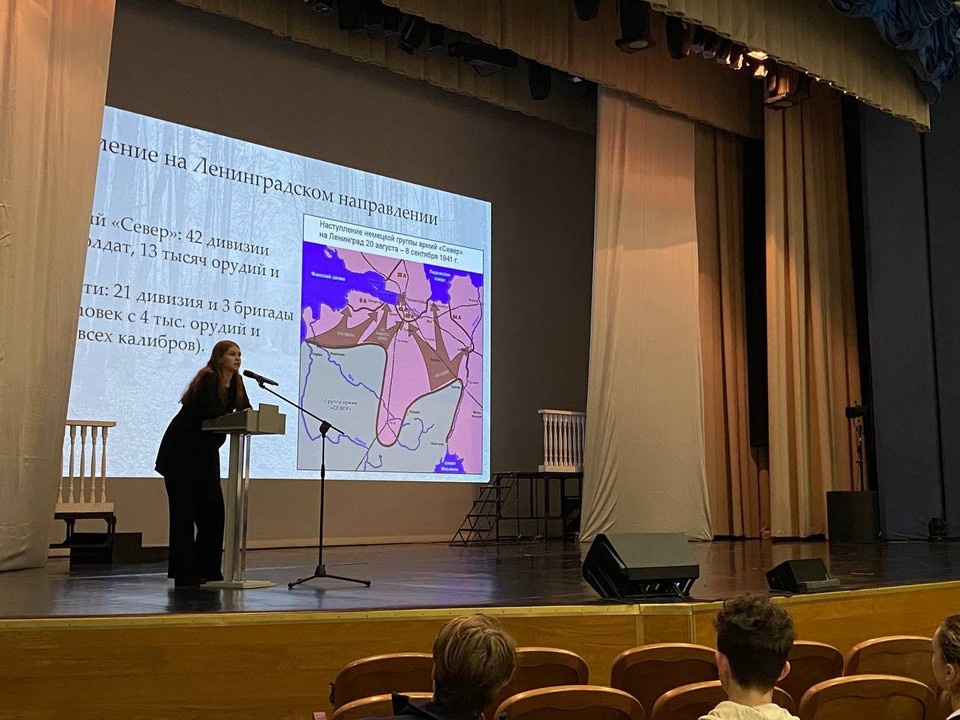 Также лицеисты вспомнили о трагедиях оккупированного Красногвардейска (ныне Гатчина). Вместе с тем прозвучали и истории мужества — например, о спасении культурных ценностей Петергофа, которые благодаря самоотверженности музейных работников и военных были эвакуированы из зоны боевых действий.