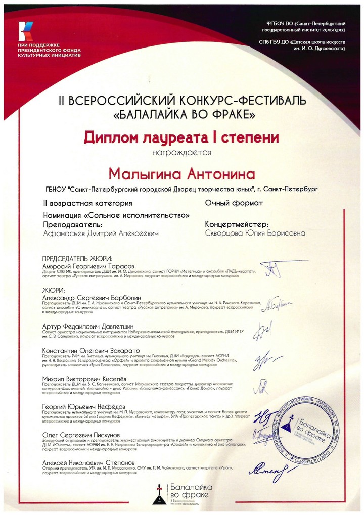 Победителем во II возрастной категории стала учащаяся Образцового детского коллектива Русского народного оркестра Отдела художественного воспитания Санкт-Петербургского городского Дворца творчества юных Антонина Малыгина.