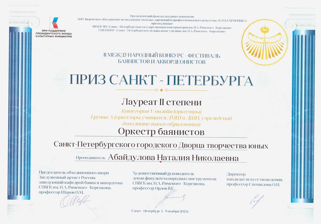 Образцовый детский коллектив Оркестр баянистов Санкт-Петербургского городского Дворца творчества юных (дирижер – Заслуженный работник культуры РФ, Н.Н. Абайдулова) достойно выступил на этом конкурсе. Юные музыканты исполнили интересную, разнообразную программу из следующих произведений:
