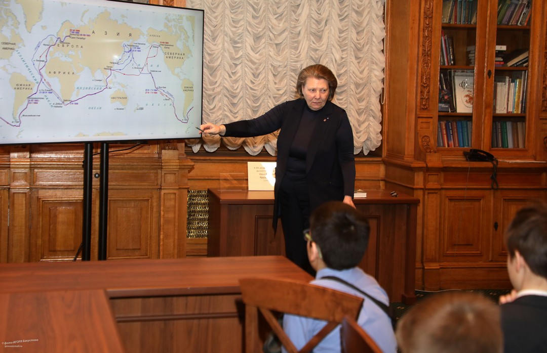 Особое внимание было уделено, конечно же, уникальным изданиям, связанным с именем великого русского мореплавателя. Юнги с удовольствием слушали про увлекательный и подробный рассказ о первом русском кругосветном плавании. Итогом плавания И.Ф. Крузенштерна стало издание трудов экспедиции: журнала путешествия, карт и рисунков.