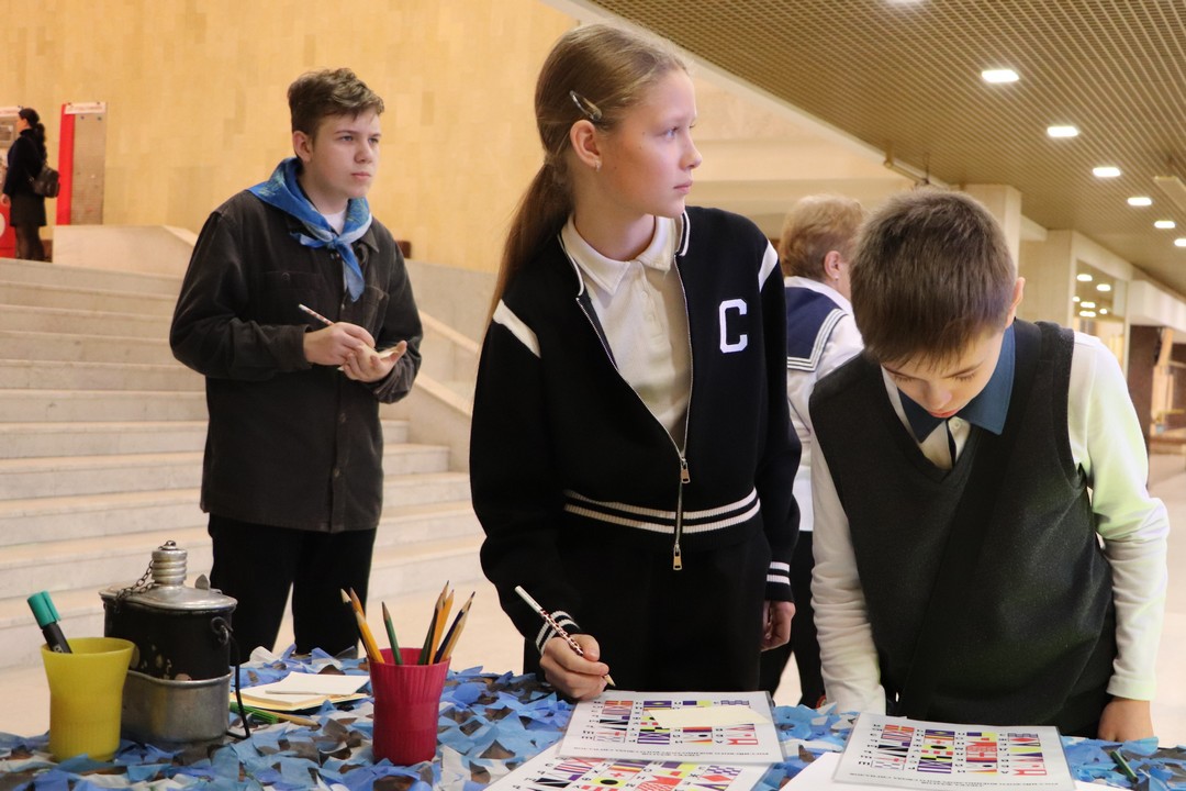 Юные активисты отвечали на вопросы викторины, работали с агитационными плакатами военного времени, расшифровывали письмо в рамках игровой программы «Партизанскими тропами», пели песни военных лет, а также разгадывали ребусы с флажковой азбукой и восстанавливали оборванную связь радиосигнала.