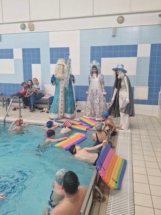 В бассейне Дворца в рамках проекта Учебно-оздоровительного отдела «Родительская школа» состоялся Новогодний аква-квест: «Путешествие по Заснеженному Лесу и Ледяному Озеру». Ребятам и их родителям предстояло отправиться в путешествие, чтобы найти украденные волшебные снежинки и растопить сердце Злого Морозилки. Первая часть пути проходила через заснеженный лес (спортивный зал), вторая — через ледяное озеро (бассейн). В празднике приняли участие воспитанники Морского клуба «Юнга», которые были пиратами и помогали ребятам преодолевать препятствия. Вместе со сказочными персонажами Снеговиком, Снегурочкой и Дедом Морозом дошкольники победили Злого Морозилку, зажгли новогоднюю елочку в бассейне и получили волшебные медали!